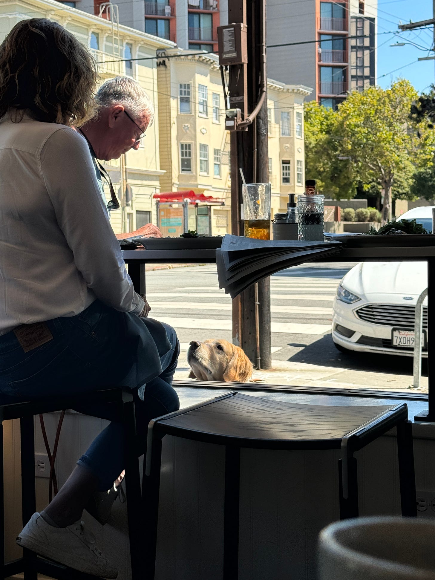 I was out to brunch for my birthday at a restaurant where they make everything in-house, even the butter. The building had these big factory windows with bar seating up against them, and the windows were open, so the bar seating looked directly onto the street with no partition. A man with a golden retriever was standing on the street side reaching into the restaurant side to grab food from a plate on the bar to give to his dog. I watched them love each other and it made me happy. Then the bagel thing happened.